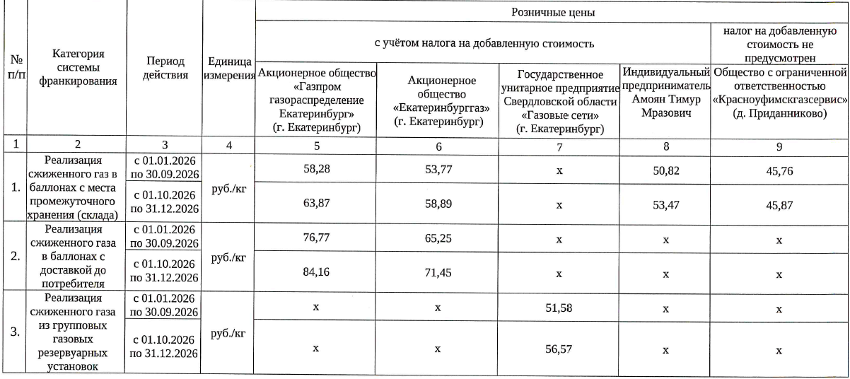 В соответствии с постановлением РЭК Свердловской области от 15.12.2025 №296-ПК с 1 января 2026 года установлены следующие розничные цены на сжиженный газ для населения: