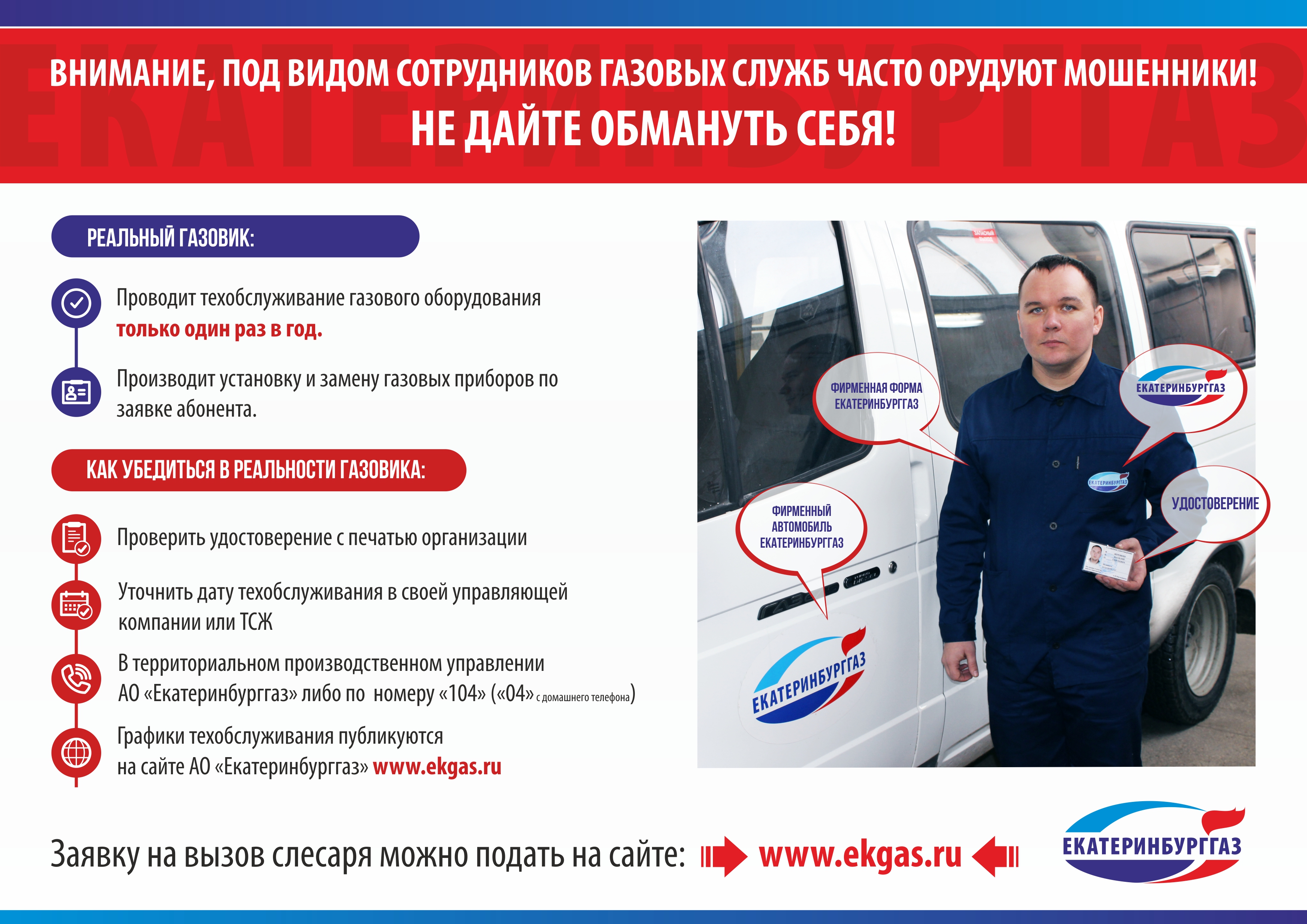 «Екатеринбурггаз» призывает горожан к бдительности. Не поддавайтесь, если люди в спецовке попытаются убедить вас немедленно заменить или установить дорогостоящее газовое оборудование. Сотрудники «Екатеринбурггаз» во время технического обслуживания газового оборудования выписывают предписания, после чего потребители сами вызывают слесаря, имеющего допуск к газоопасным работам.